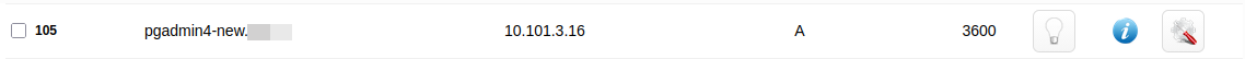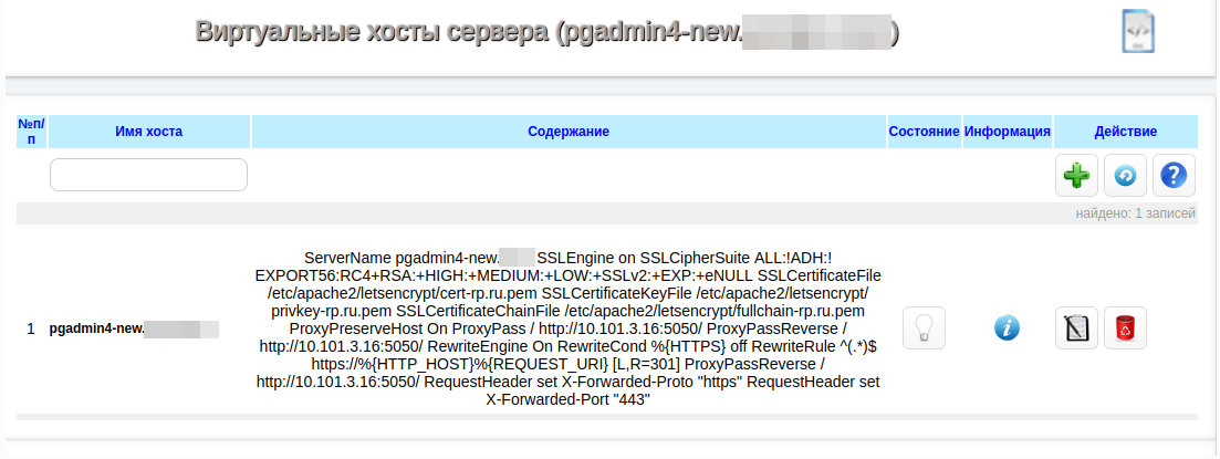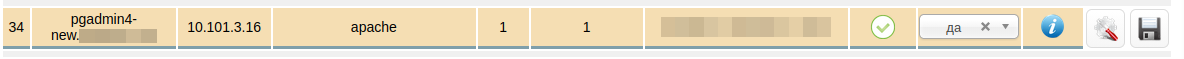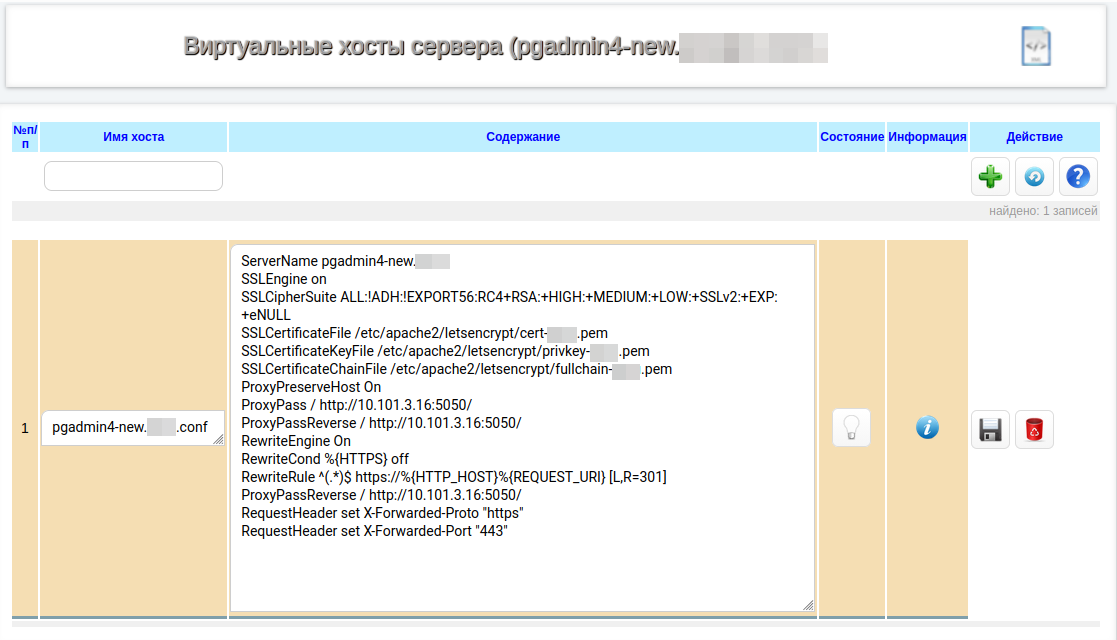 Идем в Редактировать записи внутри зоны и создаем А запись, где имя должно совпадать с именем виртуального хоста, IP адрес — это адрес сервера с apache и pgadmin4.