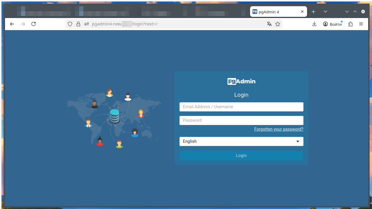После обновления зоны на DNS серверах проверяем доступность сервера с обратным прокси и пробуем войти по DNS имени на сервер и должны попасть на страничку pgadmin4.